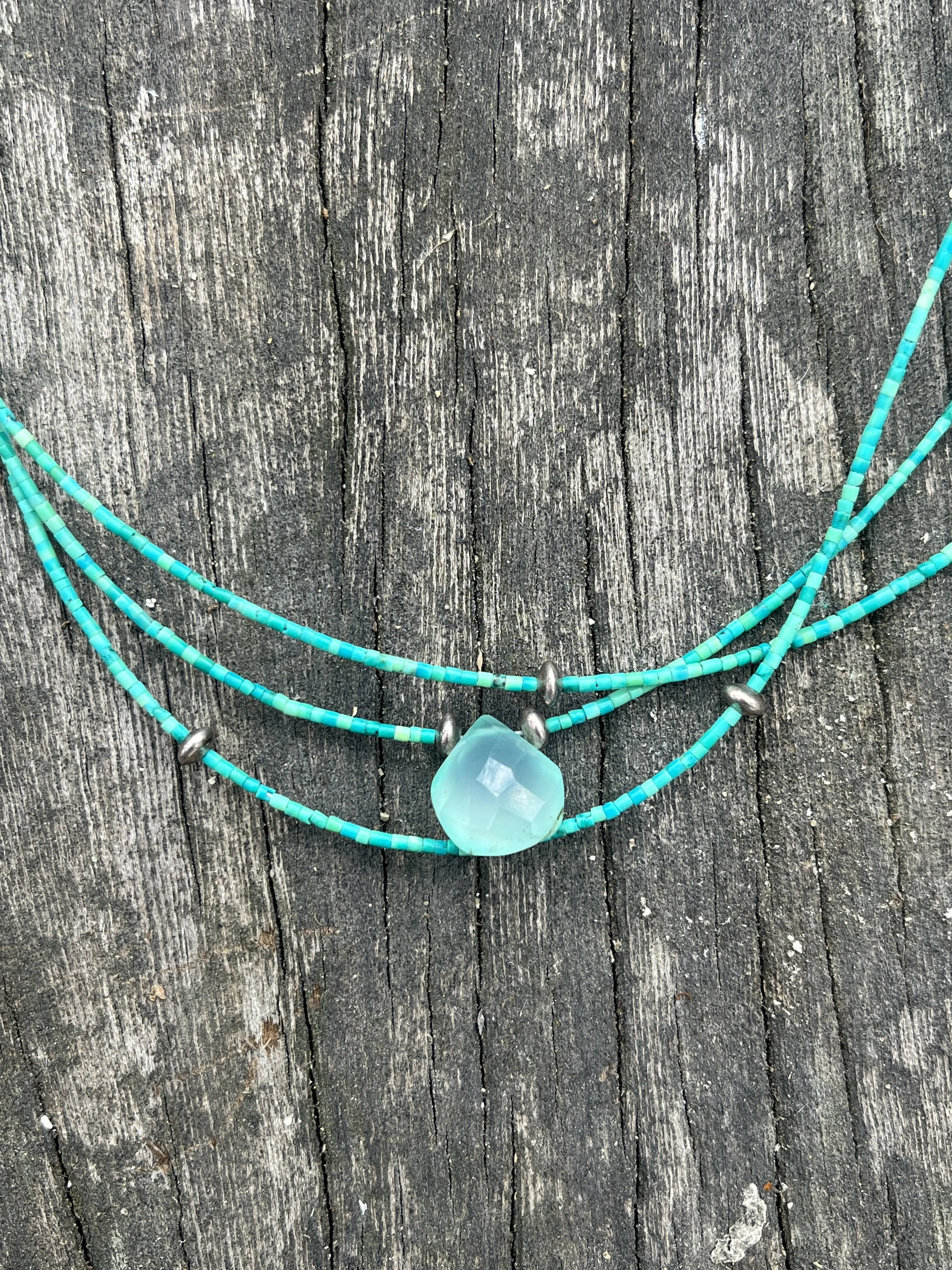 This layered necklace is made from tiny turquoise heishi beads with sterling silver and featuring a chalcedony stone. The clasp is made from sterling silver and features three mini apatite stones.
